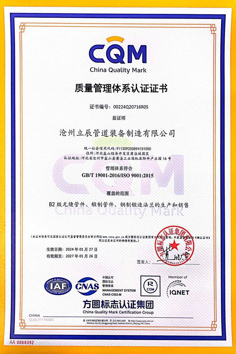 作為一家集研發(fā)、制造、銷售于一體的管件解決方案供應(yīng)商,滄州立辰管道始終秉持“匠心制造,品質(zhì)為先”的理念。公司引進(jìn)自動化生產(chǎn)線及數(shù)字化檢測設(shè)備,并組建專業(yè)技術(shù)團(tuán)隊,在耐高壓、耐腐蝕等特種管件領(lǐng)域形成獨(dú)特優(yōu)勢。此次雙認(rèn)證的通過,不僅是對現(xiàn)有實力的肯定,更為企業(yè)拓展石油、天然氣、市政工程等高端市場提供了資質(zhì)保障。